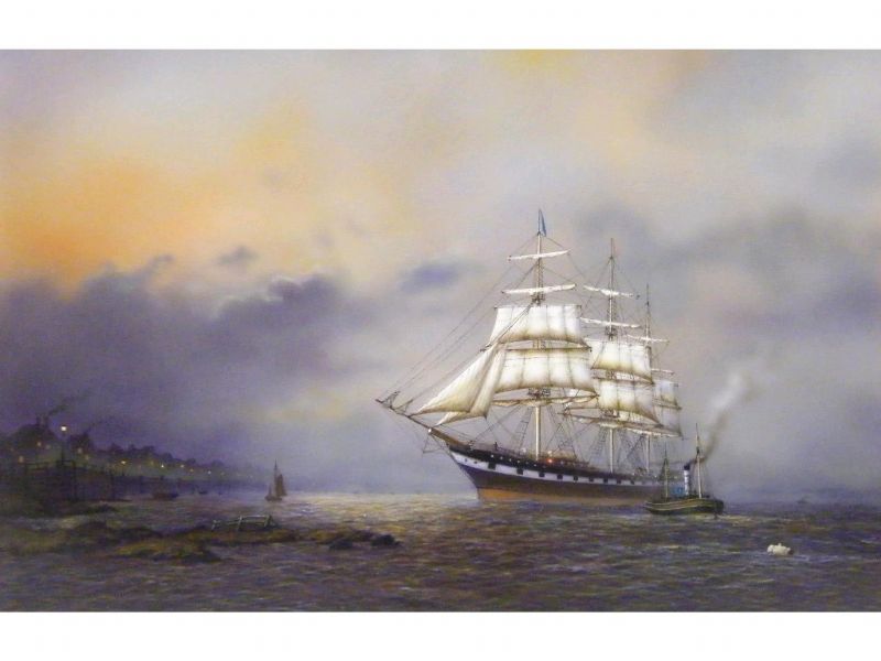 large sailing boat on the shore at dusk