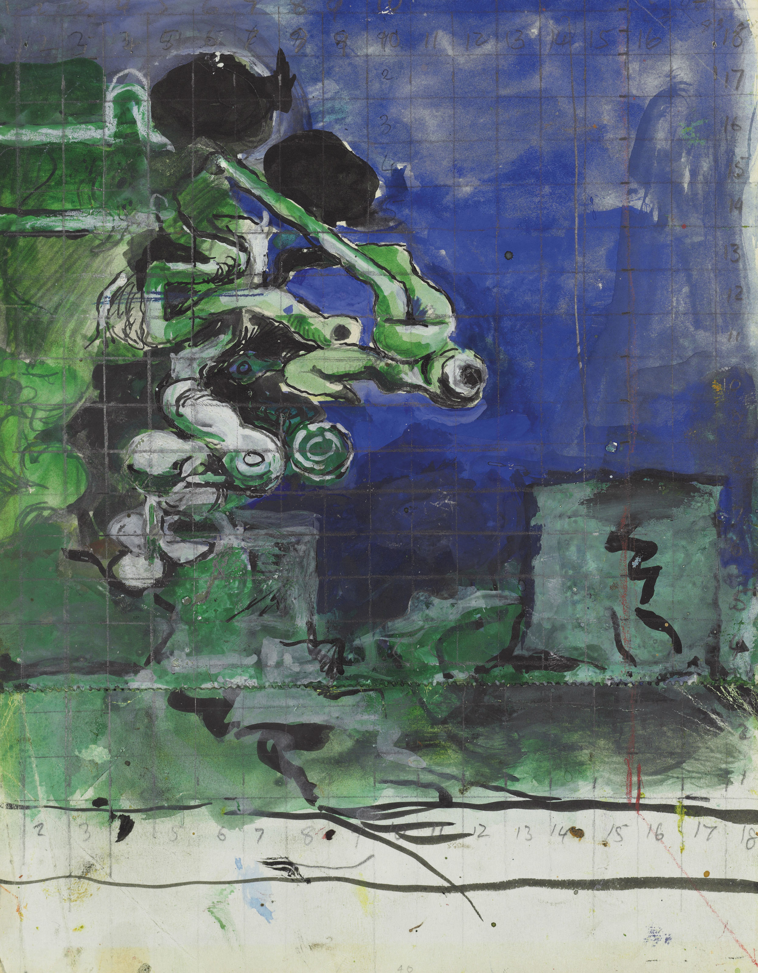 | Pencil gouache, coloured chalk and ink on two joined sheets, lightly squared for transfer | |