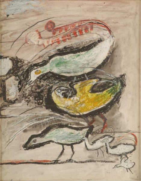 | Pencil pen, black ink, watercolour and coloured crayon | |