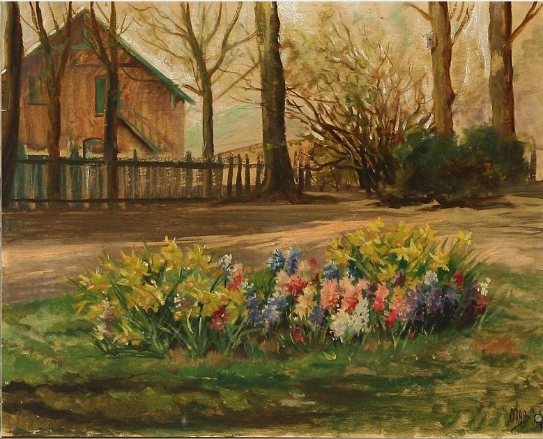 | A flower bed with daffodils and hyacinths, from Knudsminde Farm in Ballerup, Denmark | |