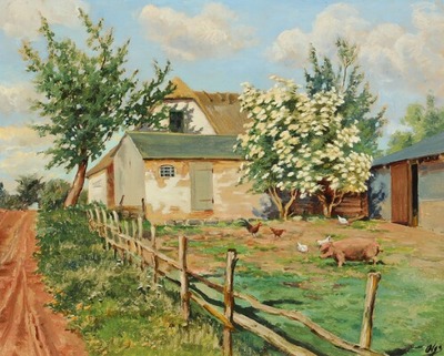 | Animals by a farmhouse on a summer day | |