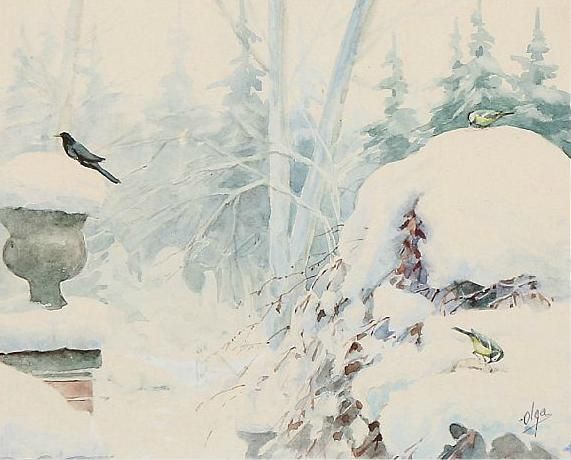 | Winter landscape with tit birds and a blackbird on Hvidøre balcony | |