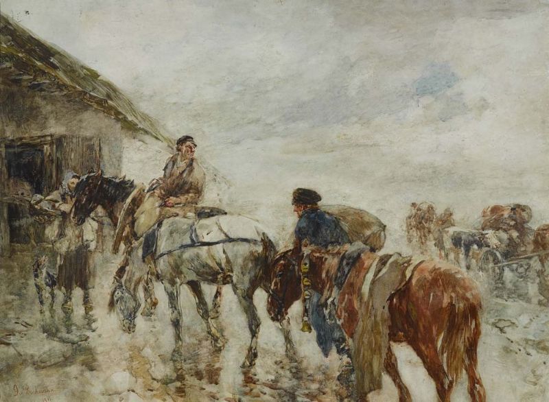 Reiter und Fuhrwerke vor Bauerngehöft