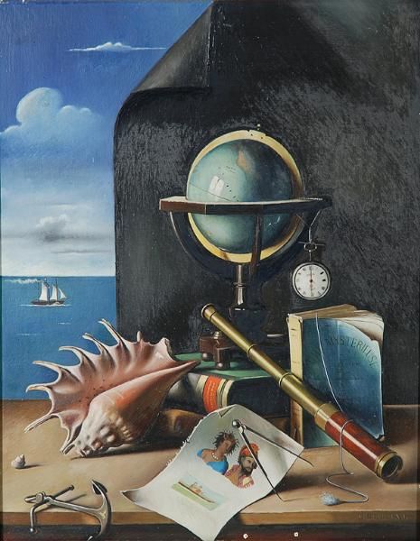 | Composizione con mappamondo, conchiglia, monocolo e marina sullo sfondo | |