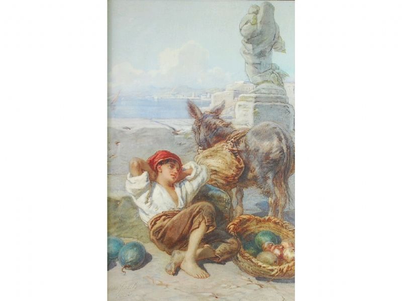 | Young Italian street vendor lost in thought reclining next to his donkey | |