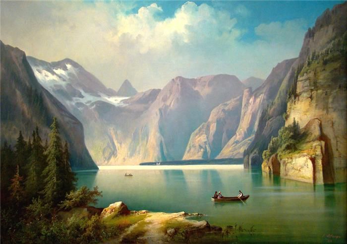 Blick auf den Königssee mit Personen in einem Ruderboot