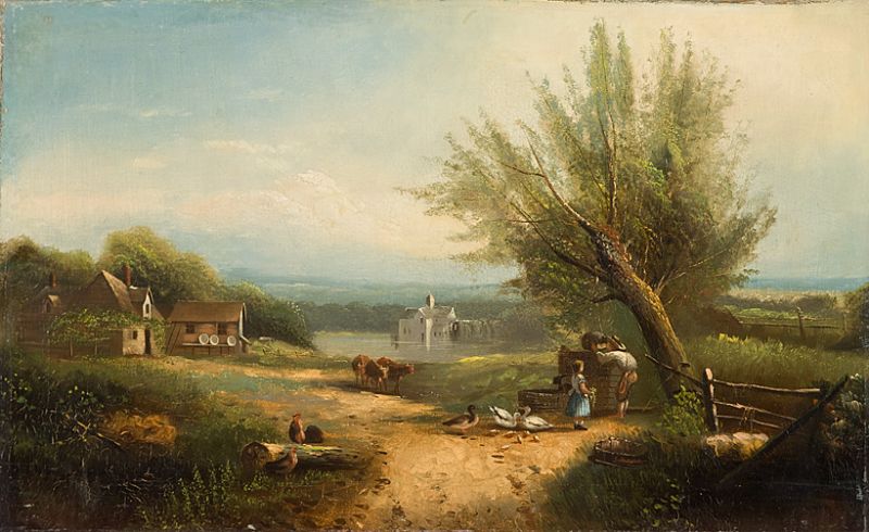 | Landschaft mit Wasserschloss und Dorfhäusern. Am Brunnen durstiger Landarbeiter und Kind. Bez | |