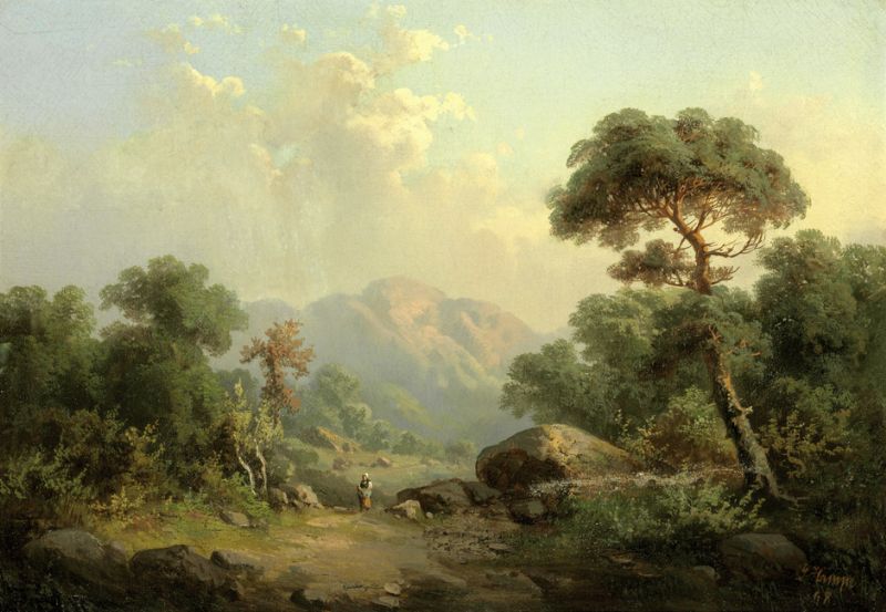 | Südliche Landschaft mit einer Bäuerin auf einem felsigen Weg im Vorgebirge | |