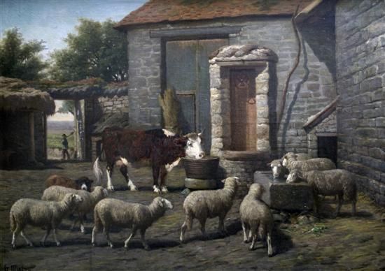 Sheep and cattle in a farmyard