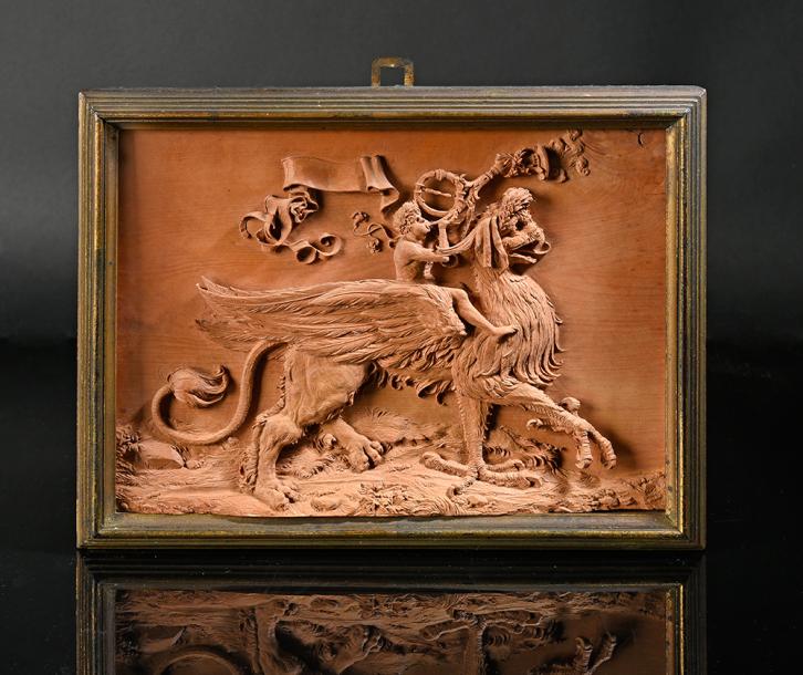 | Panneau en bois de tilleul finement sculpté d'un messager chevauchant un griffon ailé. | |