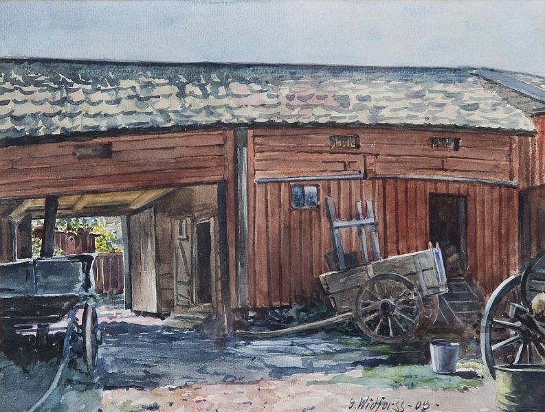 Gårdsmiljö med uthusbyggnader och vagnar.