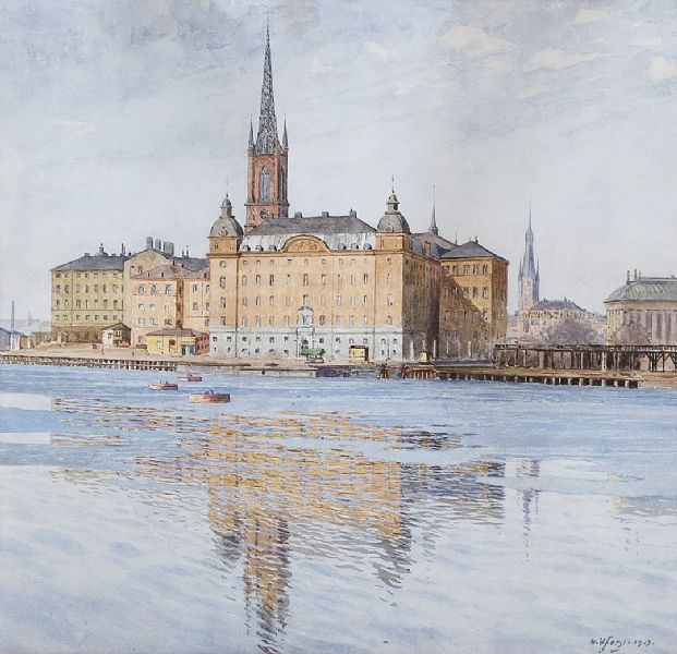 | Riddarholmen i Stockholm med gamla riksdagshusets tillbyggnad, Riddarholmskyrkans torn, Riddarhuset och i fonden Klara kyrktorn. | |