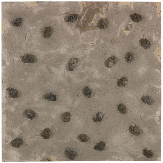 | Mixed Media Mixed media. Rocks, nails and sand on canvas on wood. | |