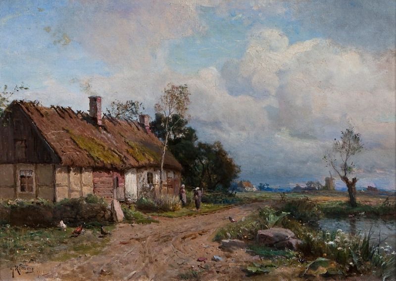 Sommarlandskap från Billinge med stuga, gummor och höns