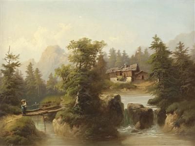 | Alpenlandschaft mit Bauernhaus am Wasser mit Personenstaffage | |