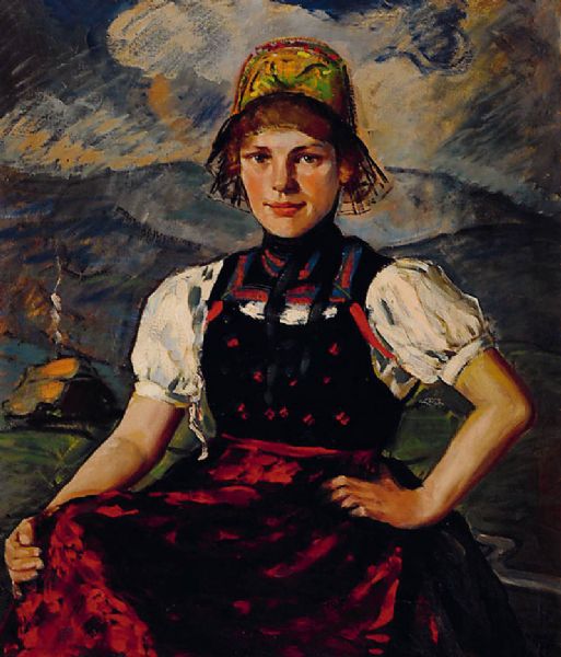Porträt einer jungen Frau in Tracht vor Schwarzwaldlandschaft
