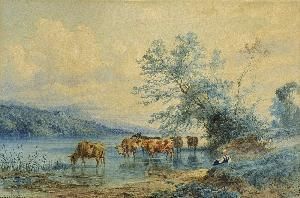 Hirtin mit Rindern am Ufer eines Vorgebirgssees.