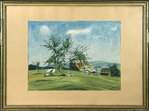 | Im Vordergrund eine Bäuerin beim Aufhängen der Wäsche unter einem Früchte tragenden Apfelbaum, daneben spielen zwei Kinder unter | |