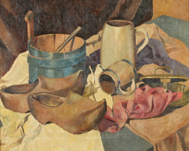 STILL LIFE WITH CROCKWARE AND WOODEN CLOGS