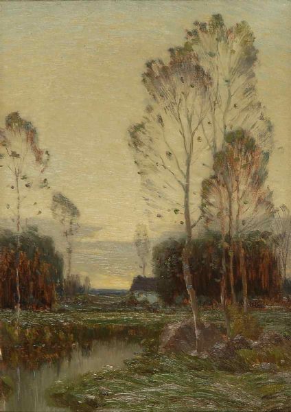 Barbizon-style sunset landscape, with crescent moon in a pink-shaded sky.