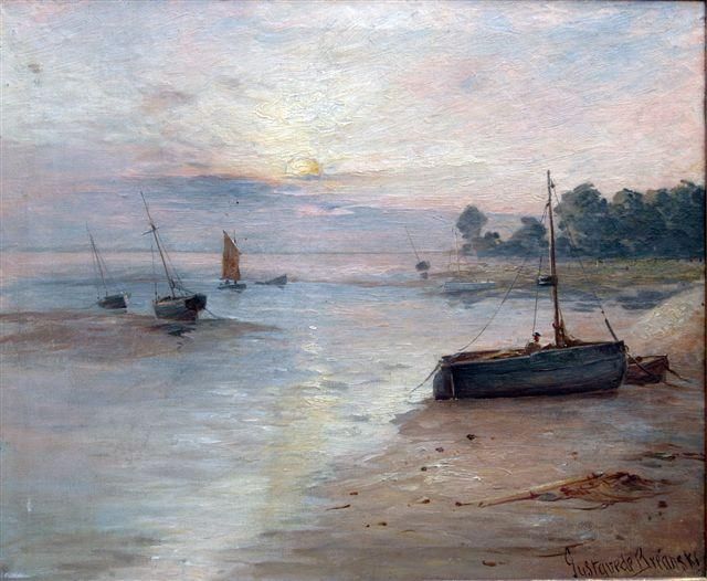 | Beached boats in an estuary at sunset; and Fishing smacks by a harbour wall at low tide a pair | |