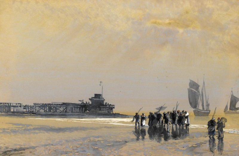 FISHERFOLK ON THE SHORE AT LOW TIDE