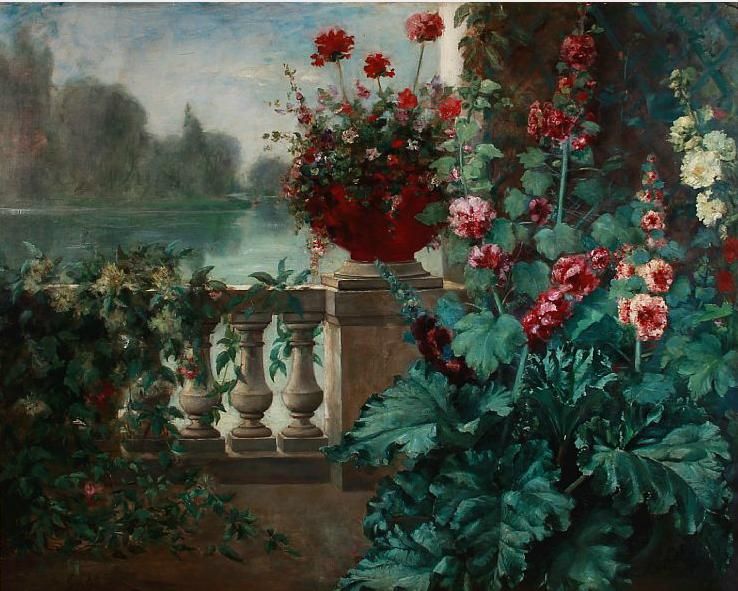 Hollyhocks in bloom on a terrace near a lake.