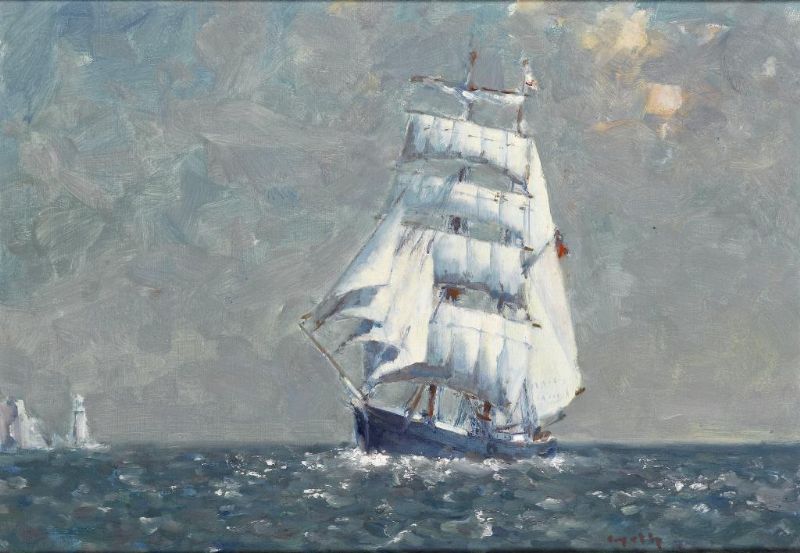 A SHIP ROUNDING A HEADLAND NEAR A LIGHTHOUSE