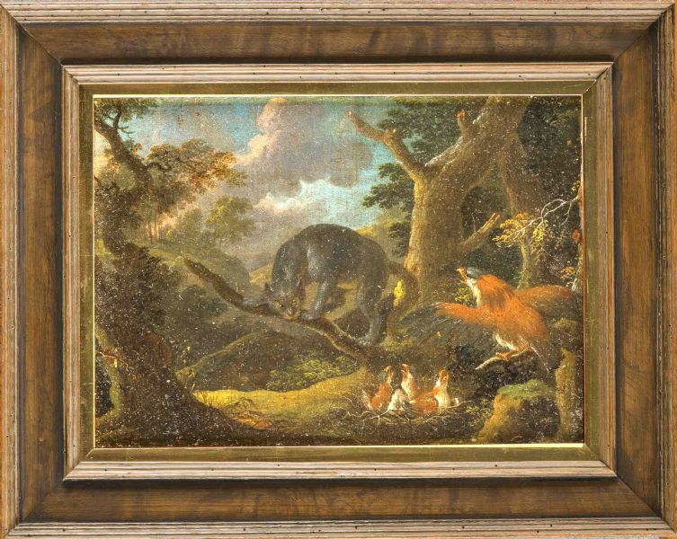 | Umfeld/Schule, ein Raubvogel beschützt mit ausgebreiteten Schwingen seine Brut vor dem Angriff einer Raubkatze | |