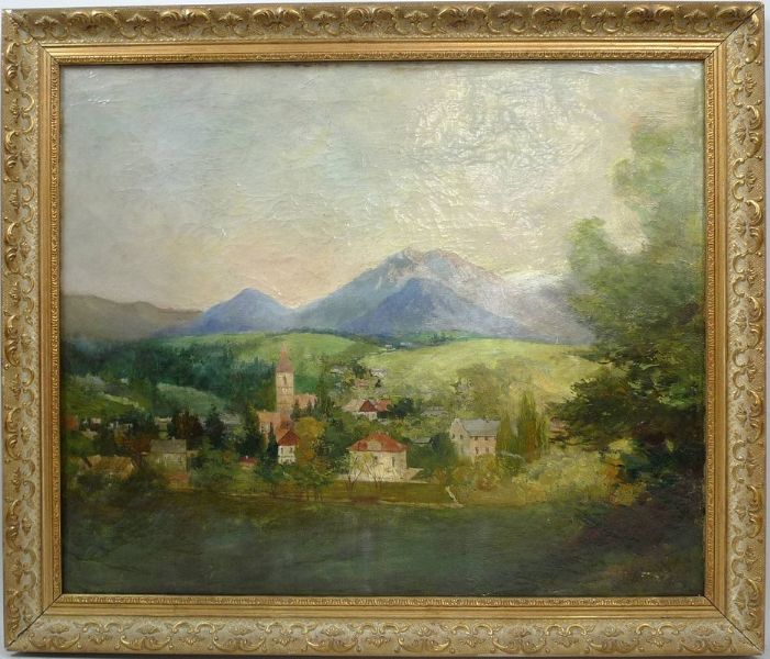 | an Austrian landscape with a village by a river, mountains beyond | |