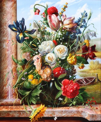 Still life with a bouquet of tulips, roses, iris and wild flowers on a stone sill