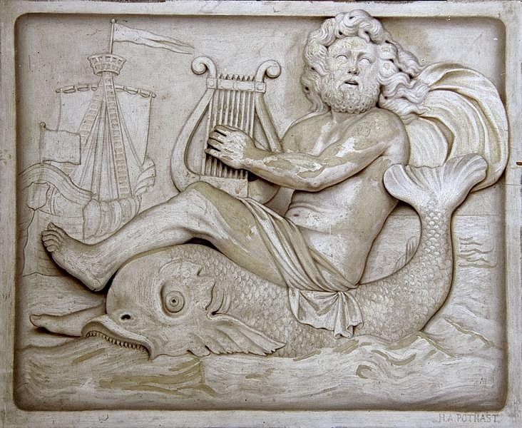 Een Grisaille met lierspelende Neptunus op dolfijn.