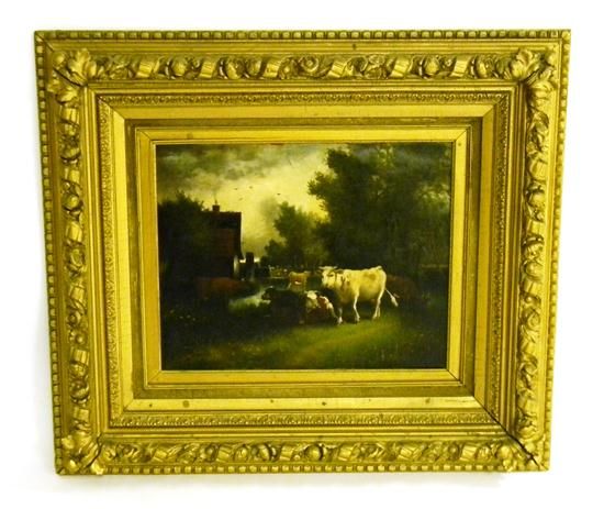 Oil painting of farm with herd of cows in foreground, water wheel in background