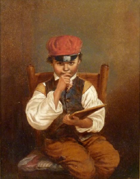 A YOUNG BOY SEATED WITH A BLACKBOARD