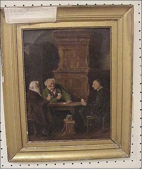 | interior scene with three gentlemen playing cards, with a glass of ale on a footstool between them, | |