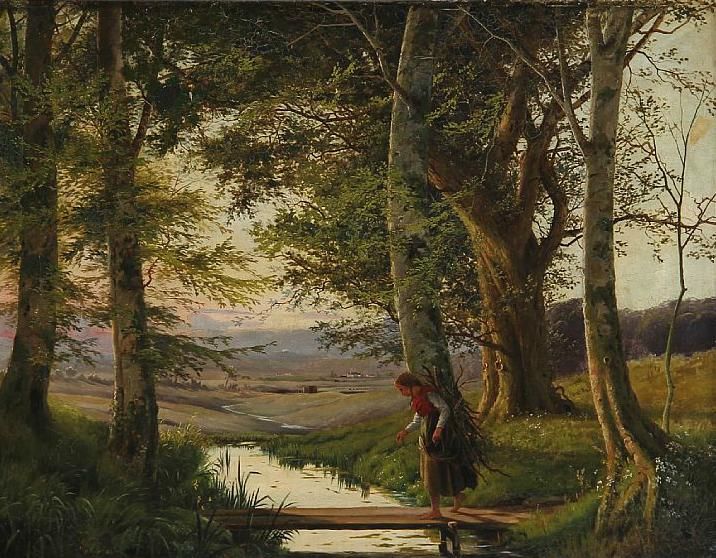 A woman with firewood on her back crossing a stream.