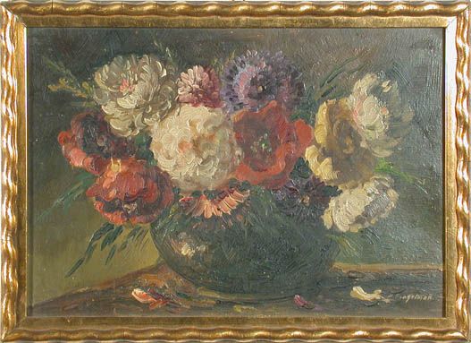 | Prächtiger Gartenblumenstrauß in kugeliger Vase, auf dem Tisch liegen abgefallene Blütenblätter | |