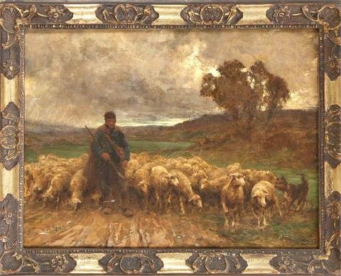 Hirte mit seiner Schafherde in herbstlicher Landschaft