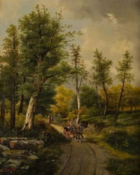 Pferdekutsche und Wanderer auf einem Waldweg