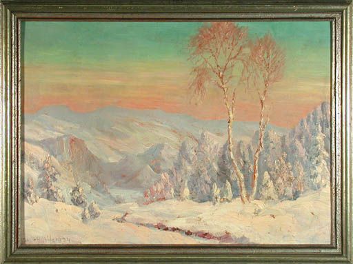 | Winterliche Abendstimmung im Hochgebirge, im Vordergrund zwei einsame Birken vor dem verschneiten Tannenwald, im Hintergrund die | |