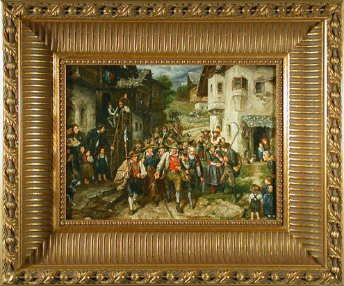 Gruppe aufständischer Bauern in einem alpenländischen Dorf