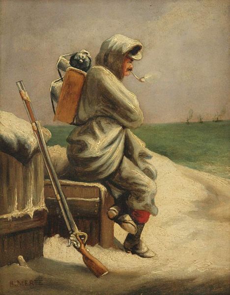 | Soldat in winterlicher Küstenlandschaft, wartend sitzend auf Proviantkisten, seine Pfeife rauchend, den Blick aufs offene Meer g | |