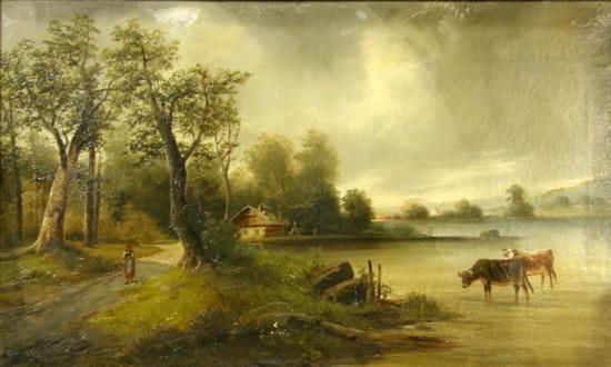 Handscape with figure on a riverside path and cattle watering