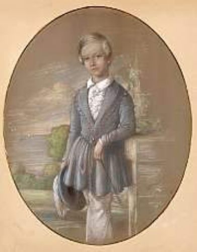 A portrait of a young boy standing three-quarter length, holding a hat and cane