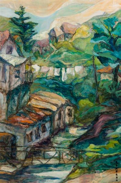 Untitled (hillside landscape with houses along a river)