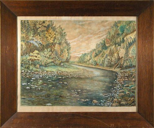 Weites, sommerliches Flusstal unter schwefligen Gewitterwolken