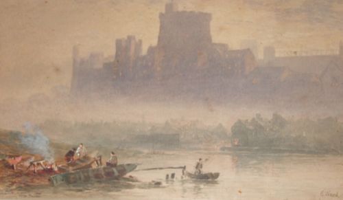 Windsor Castle in the mist with fishermen in foreground,