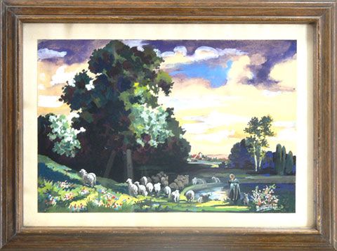 abstrakte farbenfrohe Szene eines Hirten mit seiner weidenden Schafherde an einem See