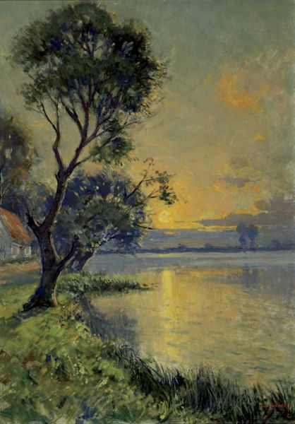 Zonsondergang bij bomen aan een rivier