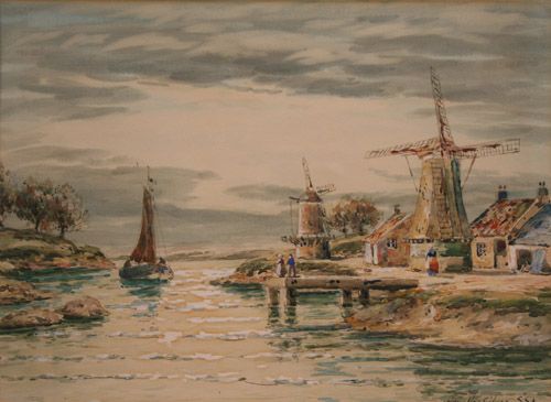| View of a Dutch Harbour with Figures on the Quayside near Moored Boats, and View of an Estuary with a Sailing Barge approaching | |